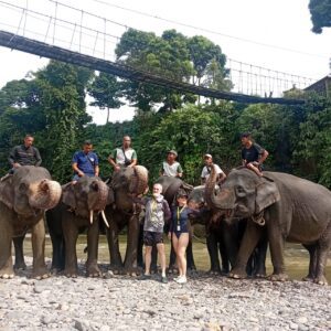 Jour 03 /Samedi : Tangkahan – Lavage d’éléphants et safari en rivièreAprès le petit-déjeuner, marche jusqu’à la station d’éléphants, puis participation à la toilette des éléphants avec les Mahout, et nourrissage des éléphants. Après avoir nourri les éléphants, descente de la rivière en chambre à air et arrêt à la fantastique cascade de Buluh où vous pourrez admirer la cascade, prendre une douche naturelle, prendre un bain de soleil et nager dans la rivière. Déjeuner pique-nique au bord de la rivière. L’après-midi, arrivée au village où vous pourrez entrer en contact avec la population locale et assister à ses activités quotidiennes. Retour à la guest house à pied, arrivée à la guest house où vous pourrez vous reposer ou visiter les sources thermales et les chutes d’eau près de la guest house.